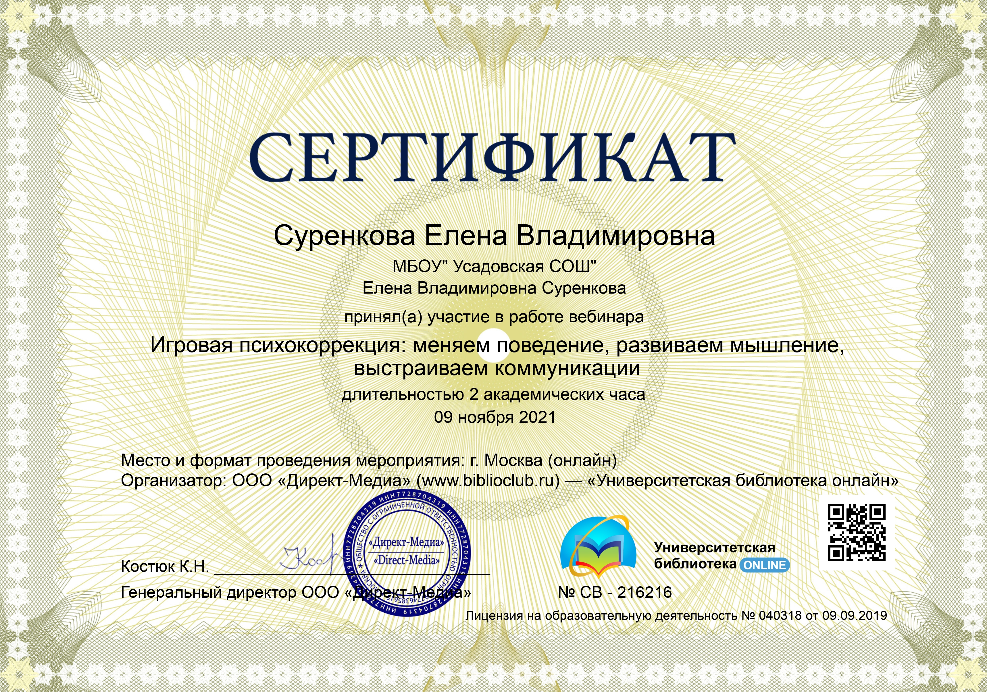 Сертификат об участии в вебинаре "Игровая психокоррекция"